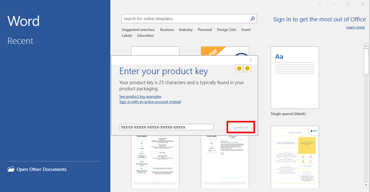 Now on the next dialog box, Enter the 25 digit Activation key and press continue.