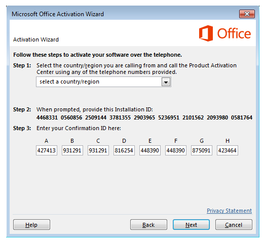 Step 3: When prompted by the Product Activation Center, provide the Installation ID that's shown in the Activation Wizard under Step 2.